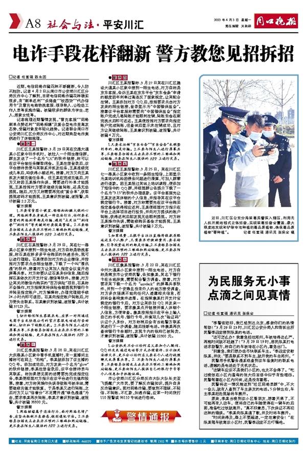 市公安局川汇区分局反诈大队大队长史亚飞提醒广大市民,要了解反诈骗知识,提升自身反诈骗意识。面对网络诈骗,要做到不理睬、不轻信、不转账、不汇款,如遇诈骗,应第一时间拨打110 报警或96110专线进行咨询。