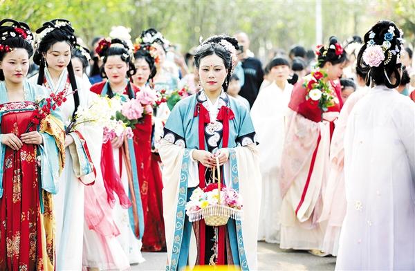 当日,鹿邑县汉服爱好者和慕名而来的游客集聚一堂共庆花朝节,见证消失数百年的迎花神、祭花神、黼禊纳祥、簪花赐福等环节的传统习俗,以及挂红祈愿、献舞花神、花仙走秀、赏花游园等传统节目。