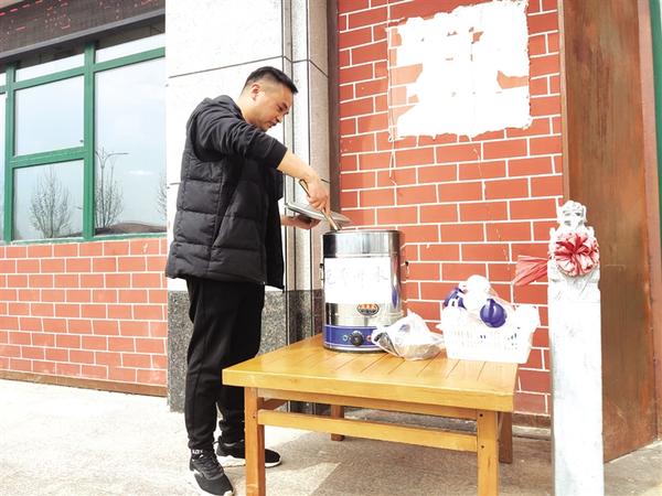 在店门前放置一张桌子,摆上一个30升的保温壶和一个塑料筐,筐里放上一次性杯子和几个2升的水杯。打开保温壶,一股浓浓的香甜气息扑鼻而来,里面是泡了红枣的茶。