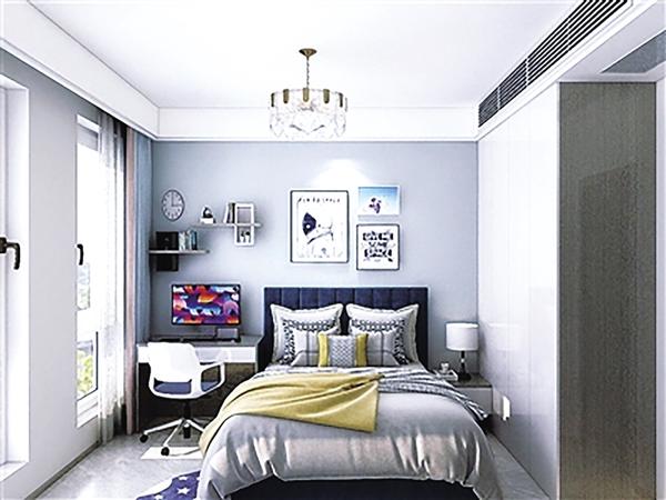 次卧1选用软包床,床上超大靠枕,让业主靠、卧都有十分舒适的体验,床头蓝色绒面设计,贴合次卧整体色调与装饰风格,使空间更和谐,居住更舒适。
