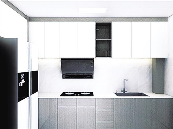 厨房定制吊柜和地柜,上浅下深,避免头重脚轻,抽油烟机嵌入在吊柜内,视觉效果更整齐;地柜分割不同功能,抽屉、柜门分别收纳不同厨房用具,满足业主收纳需求。