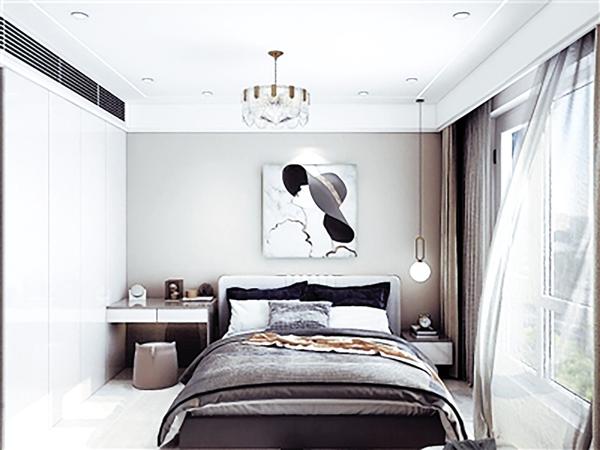 主卧采用双层窗帘,滑轨隐藏在吊顶一侧,利落、美观、不易落灰;床选用箱床,再次满足储物功能,同时避免床底留有灰尘,健康更有保障。
