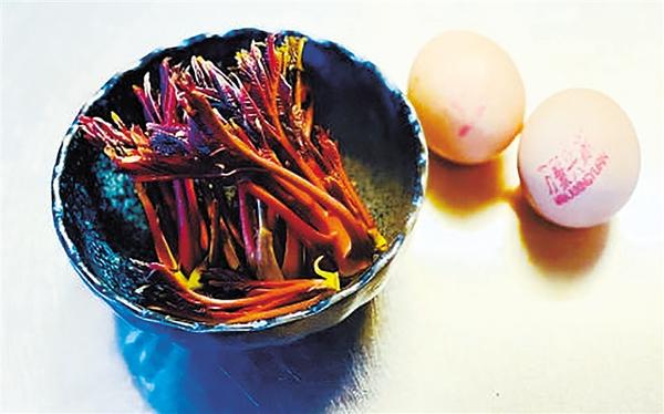 香椿的吃法很多,每年等到小芽长到两寸来长,芽叶中间变成嫩绿色时,就可以摘下来吃了。最传统的当属香椿炒鸡蛋:打几个鸡蛋在碗里加盐搅散,把香椿洗净搁开水里焯烫一下,捞出切成小段,放蛋液里一起下油锅煎成黄绿相间蛋饼,香味扑鼻。