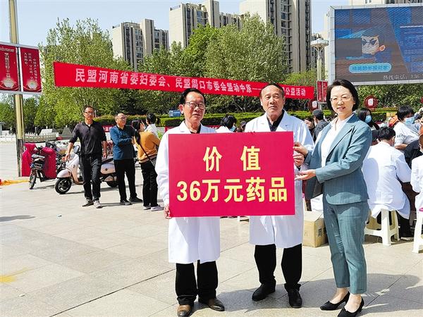 4月16日,在民盟河南省委会,川汇区区委、区政府、区卫健委指导下,由市人民医院承办的“民盟河南省委妇委会、民盟周口市委会盟动中原——义诊捐赠公益活动”在川汇区文化广场举行。当日,共为2000余名群众提供健康咨询,测量血压700余人次、血糖500余人次,捐赠药品价值36万元,为守护群众健康贡献公益力量。记者 刘伟 摄