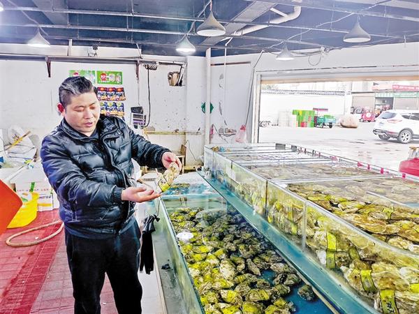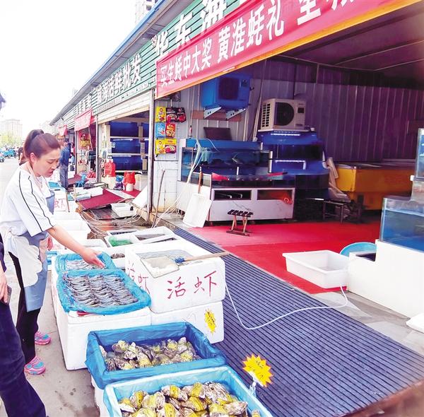 市场东区海鲜区内,光明海鲜商行、华东海鲜商行、小军海鲜等参与活动的商户都在门面房上拉起了“买生蚝中大奖,黄淮蚝礼全城乐享”的红色横幅,店内生蚝摆放整齐,价格每个从2.5元到10元不等。