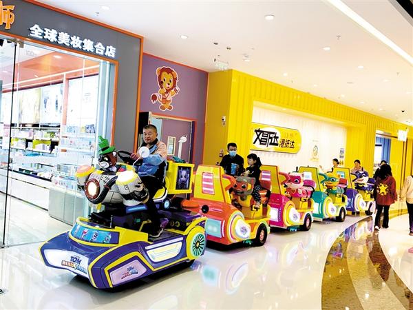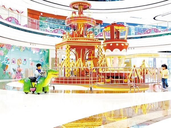 4月17日,在周口文昌万达广场,小朋友们在骑乘童乐设施上自在地玩耍。据了解,这些儿童游玩项目,可以依靠商场内的家庭消费群体获得客源,也可以帮助商场吸引客流,帮助家长带娃,使其可以更好地在商场内进行其他消费。