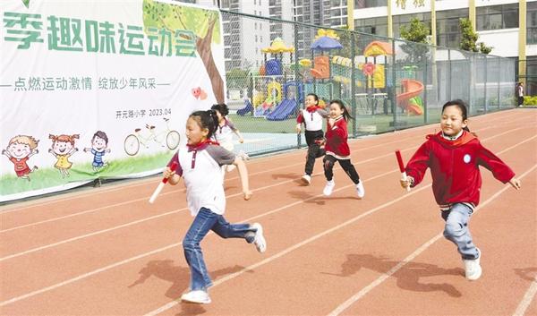 4月14日,周口经开区开元路小学举行师生趣味运动会。本次运动会的比赛项目有“两人三足”、夹背球接力赛、持杆跑接力赛、50米跑接力赛、呼啦圈比赛、教师接力赛等。图为50米跑接力赛现场。