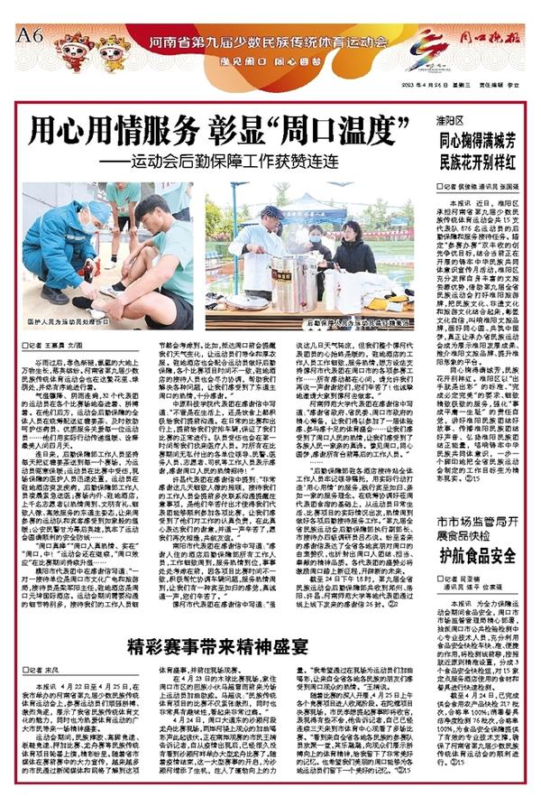 随着比赛的深入开展,4月25日上午各个竞赛项目进入收尾阶段。在陀螺项目决赛现场,市民李想提起赛事即将收官,表现得有些不舍,他告诉记者,自己已经连续三天来到市体育中心观看了多场比赛。“看到来自全省各地各民族的参赛队员欢聚一堂,其乐融融,向观众们展示拼搏向上的体育精神,给我留下了非常美好的记忆。也希望我们美丽的周口能够为各地运动员们留下一个美好的记忆。”②15