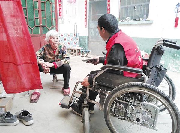 在西华县址坊镇蔡庄村,有一位靠轮椅代步的残疾人,走村串户关心着网格内居民的家长里短、急难愁盼。疫情防控、排查纠纷、各种保险缴纳信息录入、60岁以上老人的生存认证等工作,都有他的身影,他就是网格员——远凤朝。