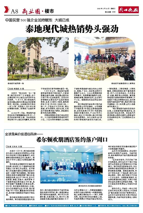 本报讯 “刚过去的‘五一’假期,我们项目卖了10多套房,这个业绩在周口中心城区众多项目中名列前茅。”5月8日,周口泰地现代城项目置业顾问刘倩说起项目销售情况一脸兴奋。让她高兴的不是这一次“小考”,而是进入2023年以来的销售好形势,热销成了这里的常态。