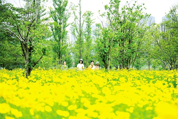 5月11日上午,市民在东方园林观赏金鸡菊,流连忘返。近日,中心城区东方园林景区内的金鸡菊盛开,金黄的花朵好像灿烂的阳光,成为周口初夏一抹诱人的风景,吸引市民前来打卡欣赏。记者 梁照曾 摄
