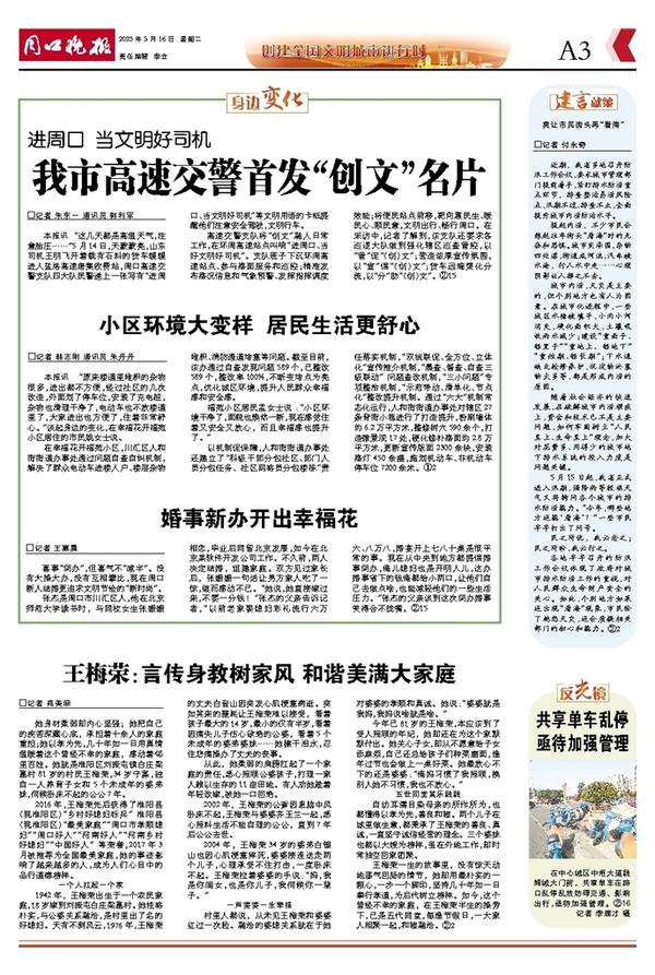 高速交警支队将“创文”融入日常工作,在环周高速站点叫响“进周口、当好文明好司机”。支队班子下沉环周高速站点、参与路面服务和巡控;精准发布路况信息和气象预警、发挥指挥调度效能;将便民站点前移,靶向惠民生、暖民心、顺民意,文明出行、畅行周口。在采访中,记者了解到,该支队还要求各巡逻大队做到强化辖区巡查管控,以“管”促“(创)文”;营造浓厚宣传氛围,以“宣”倡“(创)文”;货车远端渠化分流,以“分”助“(创)文”。②15