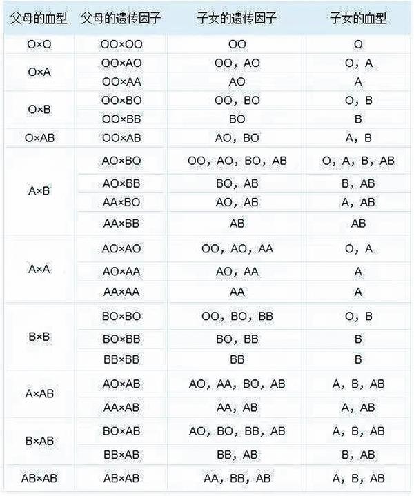 通常我们所说的血型系统是指ABO血型系统。在ABO血型系统中,红细胞上只含A抗原的称A型,含有B抗原的称B型,既有A抗原又有B抗原的称为AB型,既没有A抗原也没有B抗原的则称为O型。ABO血型受ABO三种基因控制,A基因控制A抗原产生,B基因控制B抗原产生,O基因控制不产生A和B两种抗原,而基因都是成对存在,控制ABO血型的基因可有六种不同组合,即AA、AO、BB、BO、AB、OO,每个人只有其中一对组合。