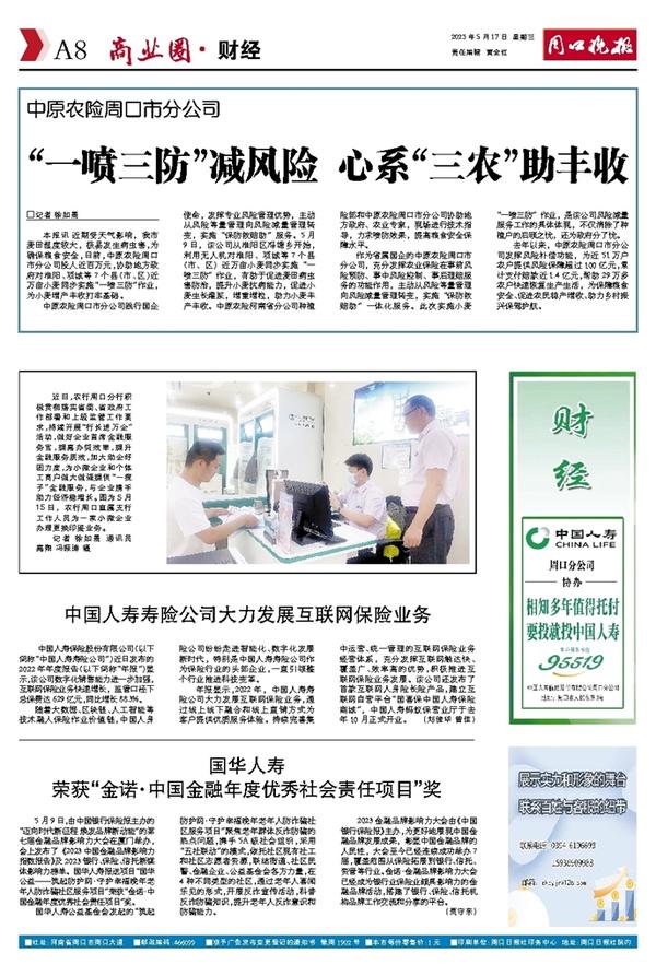 2023-05-17 中原农险周口市分公司 2 2 周口晚报 content_201611.html 1 “一喷三防”减风险 心系“三农”助丰收 /enpproperty-->