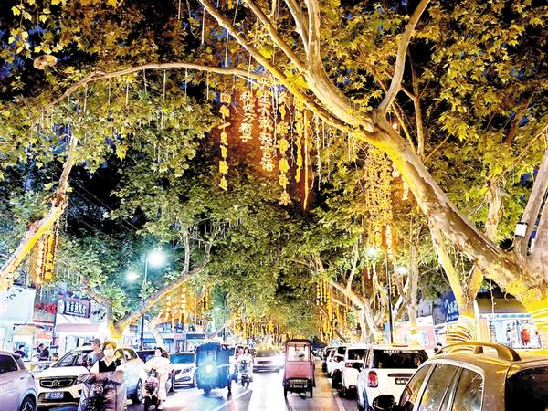 近日,在中心城区五一北路,数百条诗词灯带悬挂在道路两旁的梧桐枝头,华灯初上,市民漫步至此,在品尝各类美食的同时,仰头便是“诗海”,在烟火气中感受浓浓的文化气息。②16