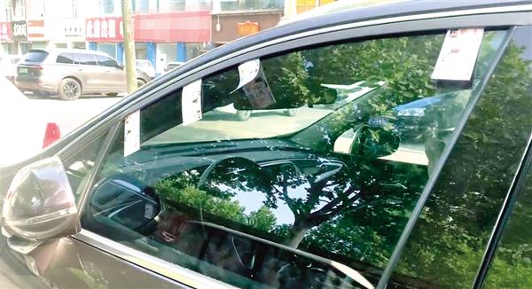 近日,在中心城区莲花路(中州大道与汉阳路段),记者发现道路南北两侧停放的私家车车窗上都被塞了多张涉黄广告卡片,汽车后视镜上都贴了涉黄广告,严重破坏市容环境、影响社会风气。(记者 王慕晨 摄)