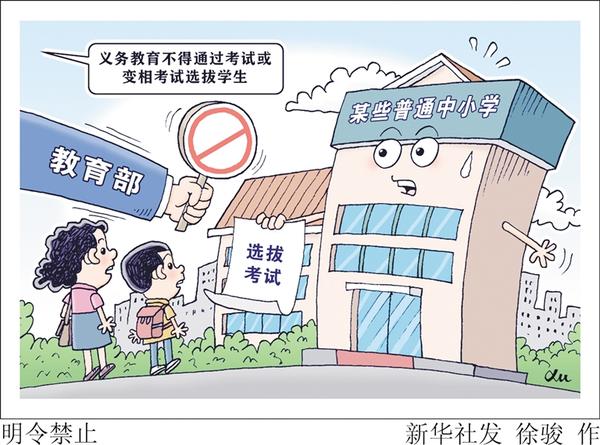 记者5月22日从教育部获悉,教育部办公厅日前发布关于做好2023年普通中小学招生入学工作的通知,要求义务教育严格落实免试入学升学规定,不得通过考试或变相考试选拔学生,不得以各类竞赛、考试证书、荣誉证书、培训证明等作为招生入学依据或参考。 新华社发 徐骏 作