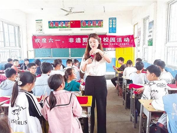 近日,淮阳剪纸传承人刘秀华指导小学生剪纸。为大力弘扬中华优秀传统文化,深入推广非遗文化剪纸技艺,周口市非遗保护中心邀请刘秀华走进郸城县汲冢镇丁寨村小学开展“欢度六一 非遗剪纸进校园活动”,给孩子们送去一个寓教于乐、充满传统文化气息的儿童节。