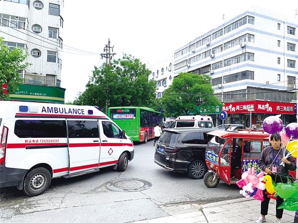 医院大门口处车流滚滚,车流量极大,却有不少营运三轮车、出租车、医疗转运车停在路边等生意,还有一些商贩见缝插针、游走售卖,让交通更显拥堵。医院保安老任拿着喇叭来回喊话:“车辆请往前走,留出急救通道。”有些车主充耳不闻,一辆挂着晋A牌照的“救援转运”车硬是在路边停了40分钟,直到拉上顾客才开走。老任叹着气说:“有时候医院的急救车被堵在门口开不进来,有关部门也经常治理,但稍有松懈这些车又围上来了。”