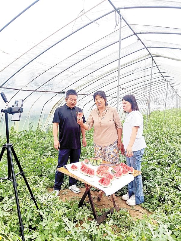 5月27日,川汇区供销社驻村第一书记史改侠(右)带领网络达人、爱心企业工作人员到邵火庙村西瓜种植基地开展直播带货和现场采购活动。