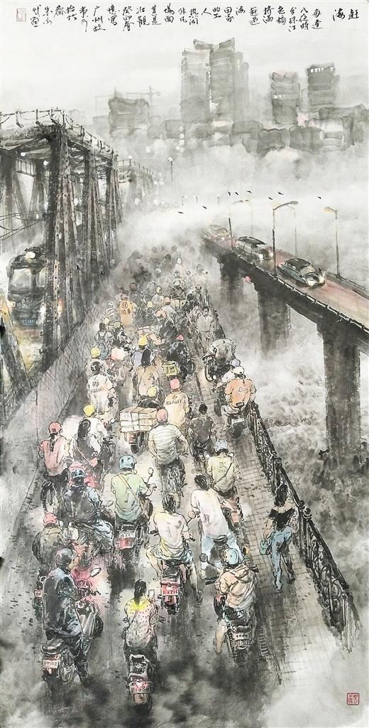 此次展出朱永成画作约百幅,题材广泛,有祖国的大好河山,也广泛涉猎异域风情。笔者印象最深的则是城市生活系列,《春潮》《赶海》《窗户》《落雨大,水浸街》《都市村庄》等广州印象画作,以纪实手法留住城市记忆,堪称现代版《清明上河图》。