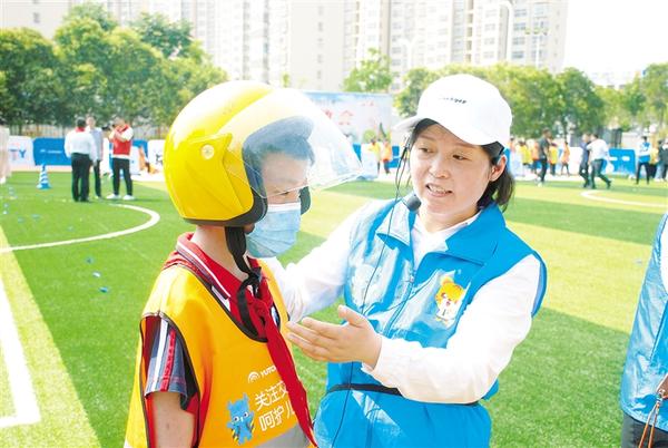 6月1日,在文昌小学校园内工作人员正在为孩子讲解安全头盔的正确佩戴方法。当日,市教体委、市交警队和市妇联联合宇通客车股份有限公司、市天虹困境儿童关爱中心开展 “关注交通安全、呵护儿童成长”活动,让孩子们度过一个不一样的儿童节。通讯员 戚团结 摄