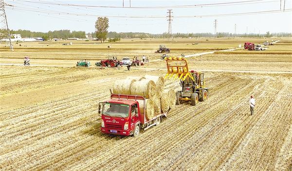 6月1日,秸秆打捆机在扶沟县七里河村田间进行打捆作业。