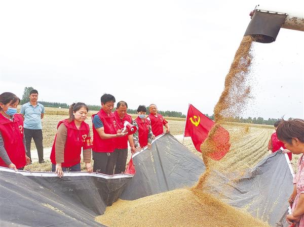 6月2日,西冯村“三夏”志愿服务队员正在帮助村民抢收小麦。近日,扶沟县江村镇各村小麦陆续成熟并进入收获期。为抢收抢种,西冯村在江村镇党委的安排部署下,帮助村民联系收割机械,组织全村党员、退役军人等20余人组建了“三夏”麦收志愿服务队,不分昼夜在田间地头抢收抢种,确保麦子归仓,秋苗尽快播种。