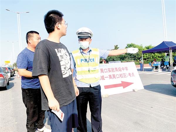 昨日,周口交警支队示范区三大队交警正在郸城一高周口校区疏导交通。