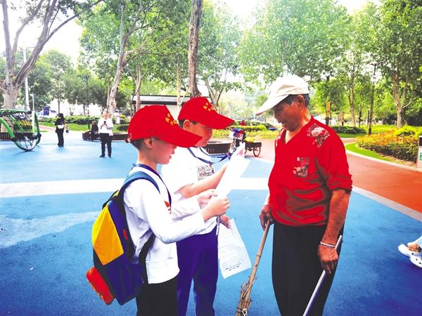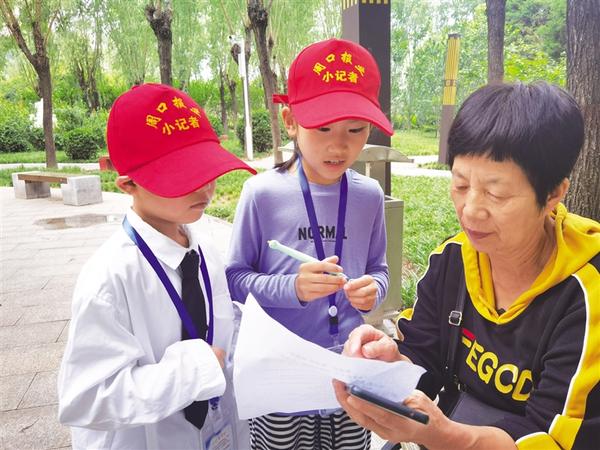 “您好!阿姨,我是周口报业小记者,我想采访一下您,请问您知道‘创文’是什么意思吗?”“您好!奶奶,‘创文’以来,您觉得城市面貌发生了哪些改变?”……小记者们一边用稚嫩的声音问着一个个关于“创文”的问题,一边记录着受访者的解答。小记者们手拿采访任务书、头戴小红帽,穿梭于公园、街头,成为了城市里一道靓丽的风景线。