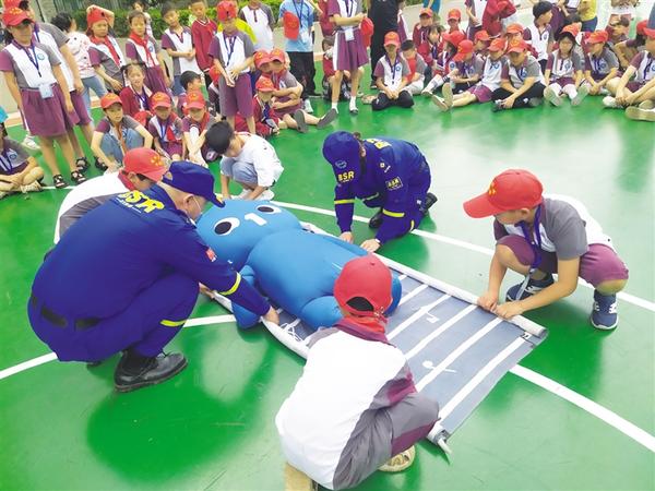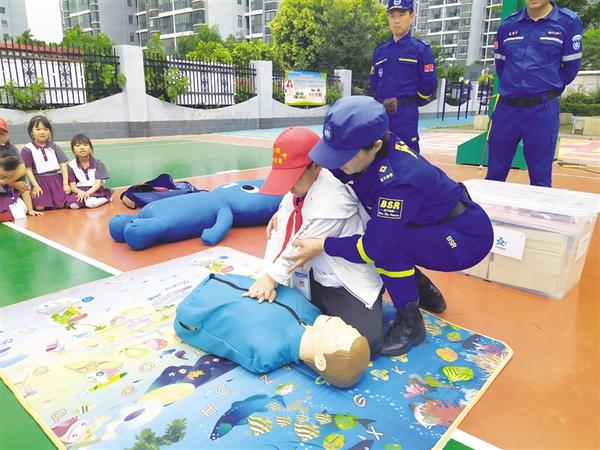校园内,救援队员手把手为小记者传授心肺复苏、溺水互救、穿戴救生衣、毛毯担架等自救互救常识。互动式、体验式的课堂,通俗而直观,参与性强,让孩子们牢记了遇见溺水等意外事件时“冷静”的重要意义。