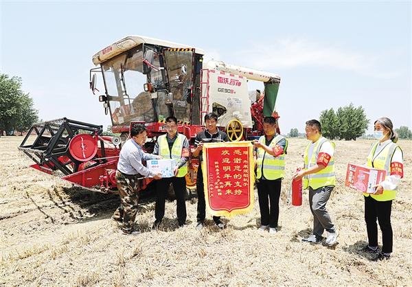 6月7日一大早,郑庄行政村村民向麦收农机手赠送锦旗。当日,郸城县东风乡党委副书记杨扬和包村干部、郑庄行政村党支部书记一起把一面印有“感谢您的支持 欢迎明年再来”字样的大红锦旗和一个灭火器、一箱方便面、一件矿泉水,赠送给支援郸城麦收工作的驻马店汝南农机手付海洋夫妻俩,感谢他们为郸城小麦收割作出的贡献。