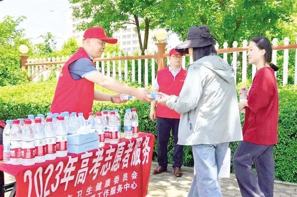 “你好同学,给你开水,小心烫。”“这位家长,送您一把扇子,请坐着休息一下。”“这有风油精,可以提神醒脑,加油。”因为刚下过雨,放晴的天气闷热潮湿,站在户外一会儿就大汗淋漓,然而这样的条件没有阻挡考生父母等候在考场外的决心。爱心企业、商家、社会团体、文明单位组织志愿者设立爱心服务点,精心准备各类解暑饮品、用具及考试用具等物品,为考生及家长提供志愿服务,助力高考顺利进行。