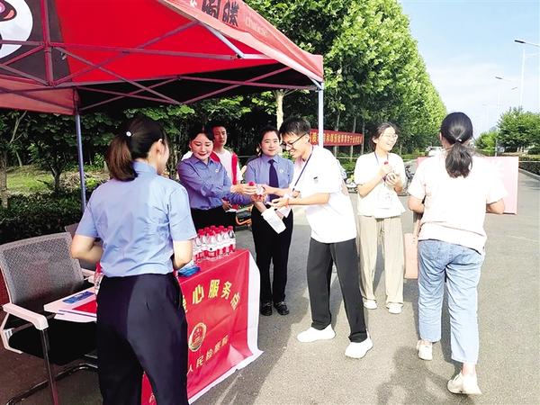 在川汇区新星学校考点,记者看到,莘莘学子怀揣梦想与希望奔赴考场,8个遮阳棚并排而列,62名“道德文明使者”为考生及家长分发饮用水、口罩、风油精、湿巾、扇子、防暑药品等物品。为弘扬志愿服务精神,展示文明使者形象,川汇区委宣传部、区新时代文明实践中心、团区委今年组织了200余辆送考车辆,招募了46家文明单位和社会志愿服务组织,200多名“道德文明使者”、志愿者,在各个考点设置38个志愿服务驿站,开展提供免费接送、心理咨询、爱心盒饭、应急救护等志愿服务活动。