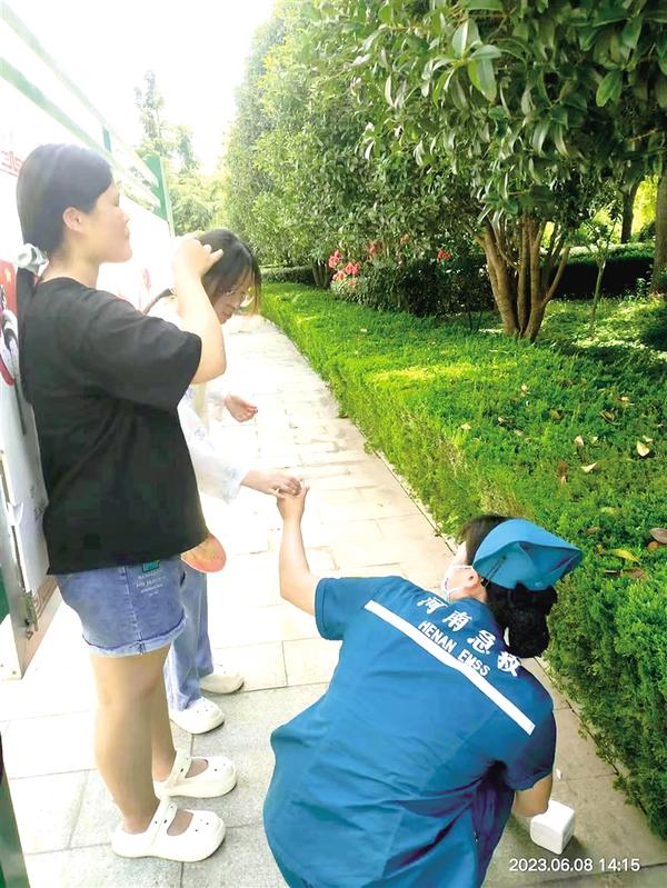 11时,天气愈发炎热,在建设路实验学校考点外,一位家长边扇扇子边说:“我家孩子今天考试,感觉时间过得好慢啊。”脸上流露出少许的紧张。在该考点提供志愿服务的市妇联巾帼志愿者刘璐茵听到后赶紧递过去一瓶水,说:“大姐来这儿坐一会喝点水吧,咱们要用平常心面对考试,别给孩子压力,心静自然凉吗……”刘璐茵的温馨举动让家长紧张的情绪一下缓解了许多。