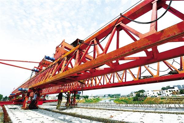 6月11日上午,周口市中心城市文昌大道西延工程的跨贾鲁河的二板交通桥第四拱桥箱梁吊装完毕。工人们随后将最后一拱桥箱梁吊装后,二板交通桥将迎来合龙。据了解,由河南省水利第二工程局集团有限公司承建的二板交通桥设计全长156米,宽30米,预计工期一年。记者 梁照曾 摄