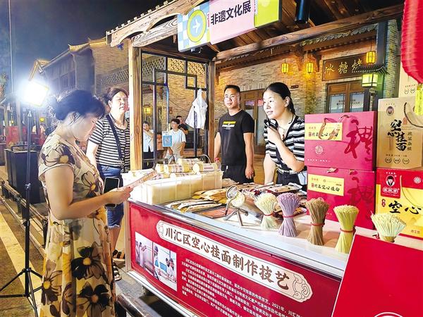 夜幕降临,华灯初上。在传统曲艺展区,沈家唢呐、河南坠子、板胡、太康道情、古琴、木偶戏、越调连番上演,游客驻足听赏纷纷叫好;在关帝老街,非遗项目周家口木版年画、刘氏剪纸、陈州酱菜、泥泥狗、布老虎、郸城泥塑、蛋雕、葫芦烙画、项城面塑、欧家棕编、老李家银饰、沈丘顾家馍、王妙钩绳编织等各色非遗产品一字排开,吸引了众多游客驻足围观,一圈逛下来,不少游客的手中已是收获满满。