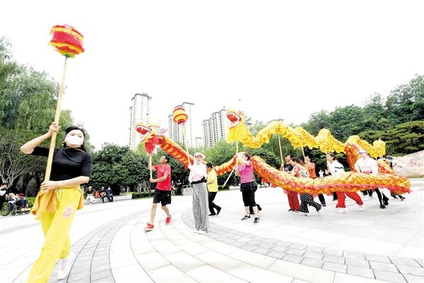 6月19日上午,川汇区多名社区居民组成的舞龙队,在周口人民公园排练节目,助力龙舟赛。