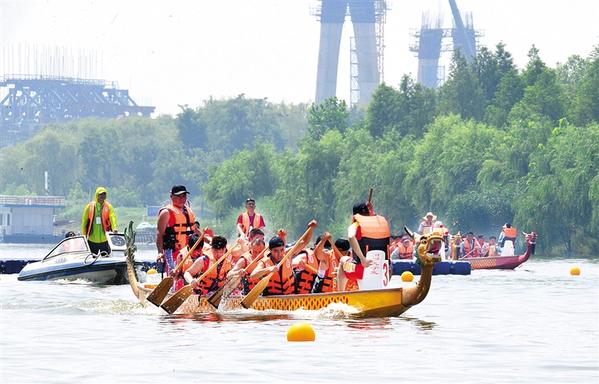 6月20日上午,周口市第八届中华龙舟赛激烈进行中。当日,河南省第十一届中华轩辕龙舟大赛暨周口市第八届中华龙舟赛在周口市水上运动中心开赛。赛前,水上拔河、翎船捕鸭等传统表演让观众大饱眼福。记者 梁照曾 摄