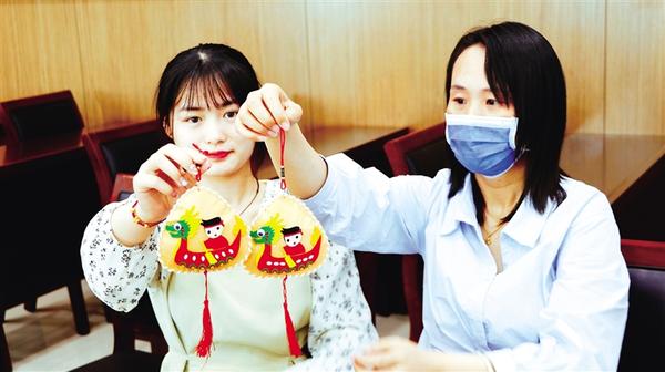 6月20日,市城乡一体化示范区工作人员展示做好的香囊。当日,市城乡一体化示范区开展“闻香过端阳 仲夏戴香囊”文明实践主题活动,从拼龙舟、缝香囊、画团扇、DIY粽子等一系列活动来沉浸式体验优秀传统手工艺文化。