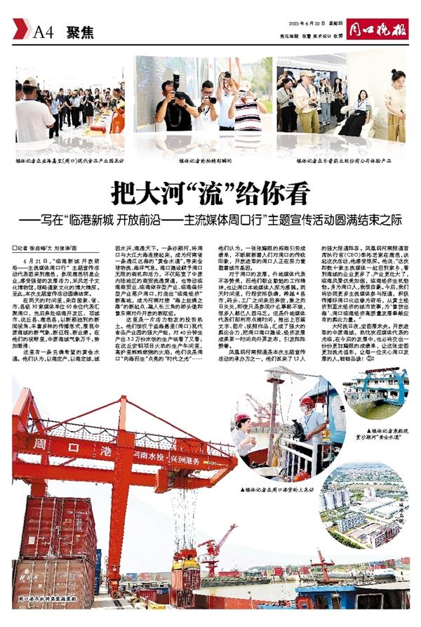 凤凰网河南频道是本次主题宣传活动的承办方之一,他们派来了12人的强大报道阵容。凤凰网河南频道首席执行官(CEO)李彬老家在鹿邑,谈起这次活动,他感受很深。他说:“这次和数十家主流媒体一起回到家乡,看到港城的企业更多了、产业更壮大了,临港风景优美如画,临港经济生机勃勃。身为周口人,我很自豪。今后,我们将协同更多主流媒体参与报道,积极传播好周口化边缘为前沿,从黄土经济到蓝水经济的城市故事,为‘豫货出海’、周口临港经济高质量发展奉献应有的舆论力量。”