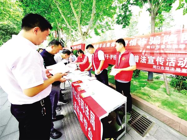 近日,周口市司法局在中心城区五一文化广场开展了“守好钱袋子·护好幸福家”防范非法集资普法宣传活动。活动中,通过悬挂宣传条幅、发放宣传手册、解答群众咨询等形式,结合具体案例,为过往群众详细讲解非法集资的表现形式、常见手段及防范举措,提醒群众时刻警惕非法集资陷阱,避免盲目投资和冲动交易,守护好自己的“钱袋子”。通讯员 王红新 袁净 摄