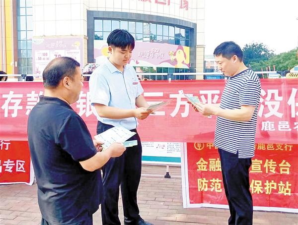 为提升消费者金融素养,稳定金融消费者信心,近日,农行周口分行深入开展“普及金融知识万里行”活动。该行紧紧围绕广大群众关注的热点、难点问题,在繁华街区设立 “金融知识咨询台”,营造宣传氛围,采用群众喜闻乐见的形式,将通俗易懂、贴近实际的金融知识全方位、高质量、多角度地送到群众手上。图为近日,农行鹿邑支行工作人员向群众讲解防诈骗金融知识。