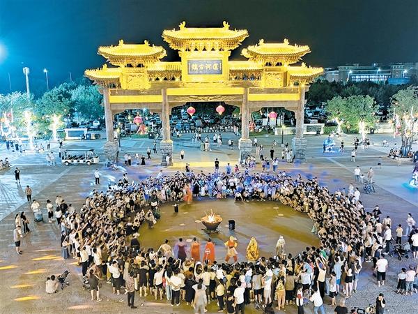 21时许,古韵广场成了活动的主角,《西游记——降妖除魔》上演,唐僧师徒与现场游客热情互动,吸引着更多的人参与。21时20分,篝火晚会开始,火苗摇曳,音乐响起,大家不由自主地手拉着手组成人环,开心地唱啊跳啊!人越聚越多,环越拉越大,古韵广场成了欢乐的海洋。