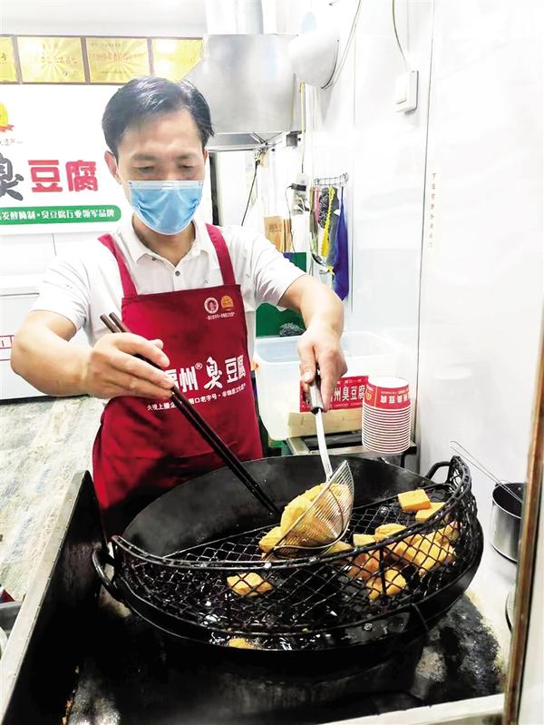 火车造型的餐车里,工作人员正在忙碌着。白嫩细腻的豆腐整齐排列在餐盘里,偶有顾客前来捧场,询问要什么口味后,便一手将长筷插在盛满热油的锅边,一手抄起一块豆腐顺着筷子滑进热油里。“炸第一遍小火慢炸,捞起,再开大火复炸一遍。”经验丰富的王福州臭豆腐第四代传承人王福州说,豆腐复炸一分钟左右捞出控油,再用筷子收取适量装盒,浇上用30多种中草药秘制的酱汁再配上香菜,递到食客手里时还冒着热气。