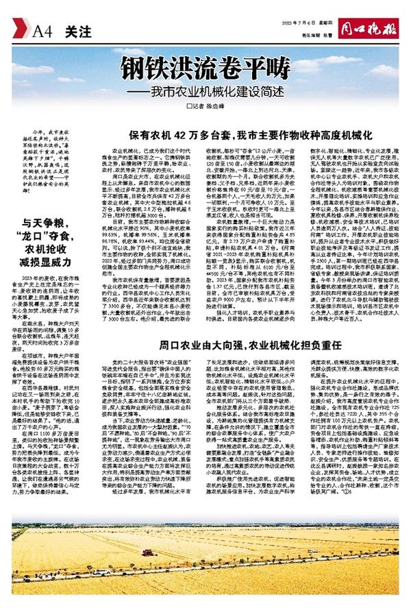 目前,我市主要农作物耕种收综合机械化水平接近90%,其中小麦机收率99.63%,机播率99.56%,玉米机播率96.78%,机收率93.44%,均位居全省前列。可以说,除了极个别不适宜地块,我市主要作物的收种,全部实现了机械化。2022年,经过多部门共同努力,周口成功创建全国主要农作物生产全程机械化示范市。