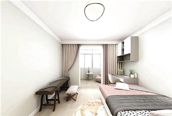 为增加次卧的居住空间,将次卧与阳台之间的窗户改为垭口;将阳台纳入次卧空间。利用沙发椅和小茶桌打造出休闲区域,孩子拥有自己的小天地,可以在此读书娱乐,床侧放置古筝,满足孩子的兴趣爱好。次卧的多功能区域设计既满足老人陪伴孩子的需求,孩子还可以有自己的玩耍空间,享受无忧快乐童年。