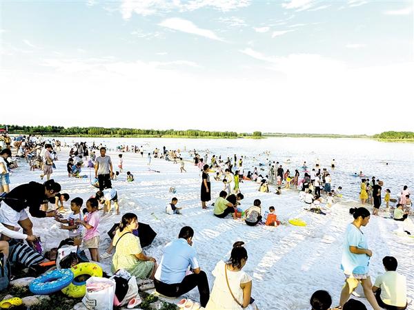近日,上千名家长带领孩子在市城乡一体化示范区引黄调蓄水域“白沙滩”浅水区戏水消暑。入伏之后,天气炎热。为了防暑降温,我市不少市民选择亲水活动,乐享夏日清凉。②16记者 付永奇 摄