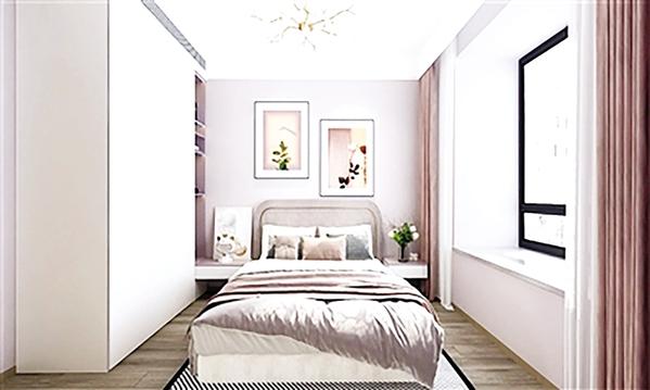次卧1设计为女孩房间,淡粉色墙漆涂刷,搭配可爱梦幻吊灯,与白色顶部、木色地板结合,打造一个现实中的梦幻小屋。