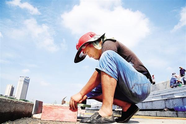 7月30日上午,工人们在沙颍河(八一大道至中州大道段)堤岸改造工程工地紧张施工。此段作为沙颍河市区三期综合治理工程之一,经过几个月的施工,内堤治理中的堤坡改造成台阶状,建成后可供游客观光休息,也可为此段沙颍河开展水上娱乐活动提供观景台。记者 梁照曾 摄